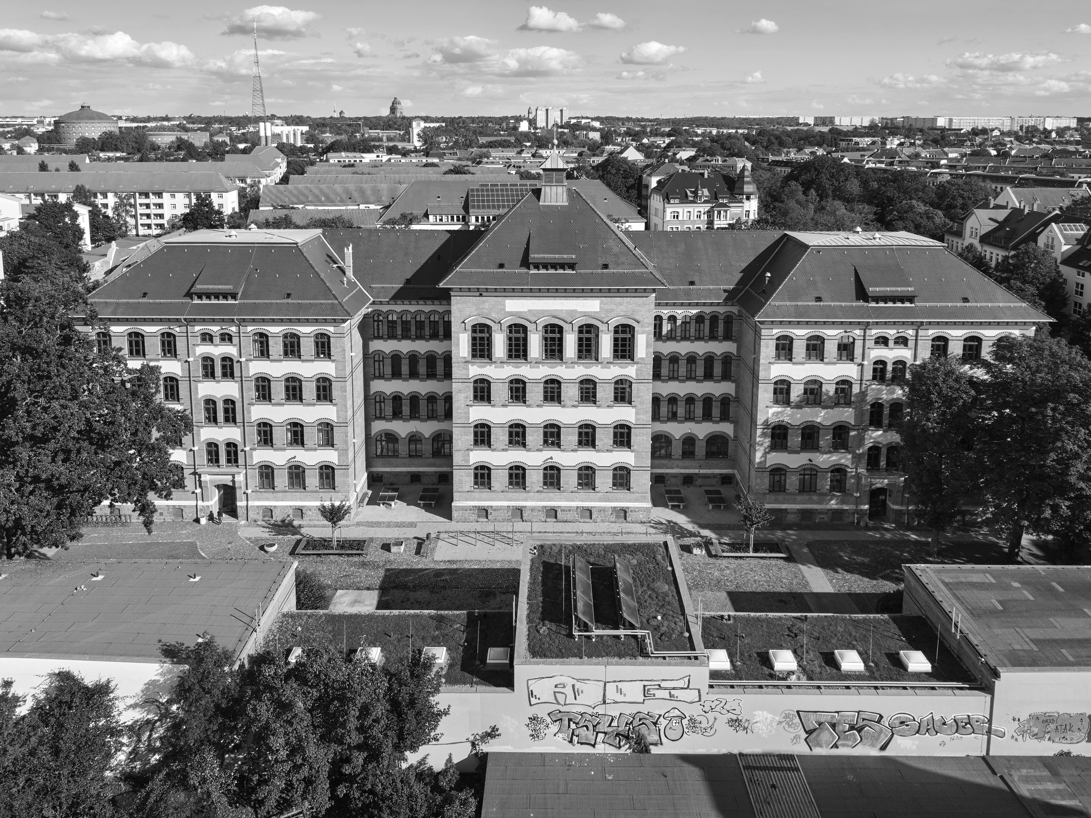 Die Apollonia-von-Wiedebach-Schule in Leipzig Connewitz wurde nach einer Havarie grundlegend saniert und modernisiert. Dies umfasste die Erneuerung von Heizungsanlagen, Trink- und Schmutzwasser-Leitungen, Sanitäreinrichtungen und Elektroanlagen. Alle Räume wurden neu hergestellt und sowohl funktional als auch gestalterisch auf den neuesten Stand gebracht. Zusätzlich wurde ein viergeschossiger Erweiterungsneubau in Verbindung zum denkmalgeschützten Altbau errichtet. Der Neubau erweitert die Schule um eine Mensa, acht Unterrichtsräume, eine Bibliothek und die notwendigen Nebenräume.