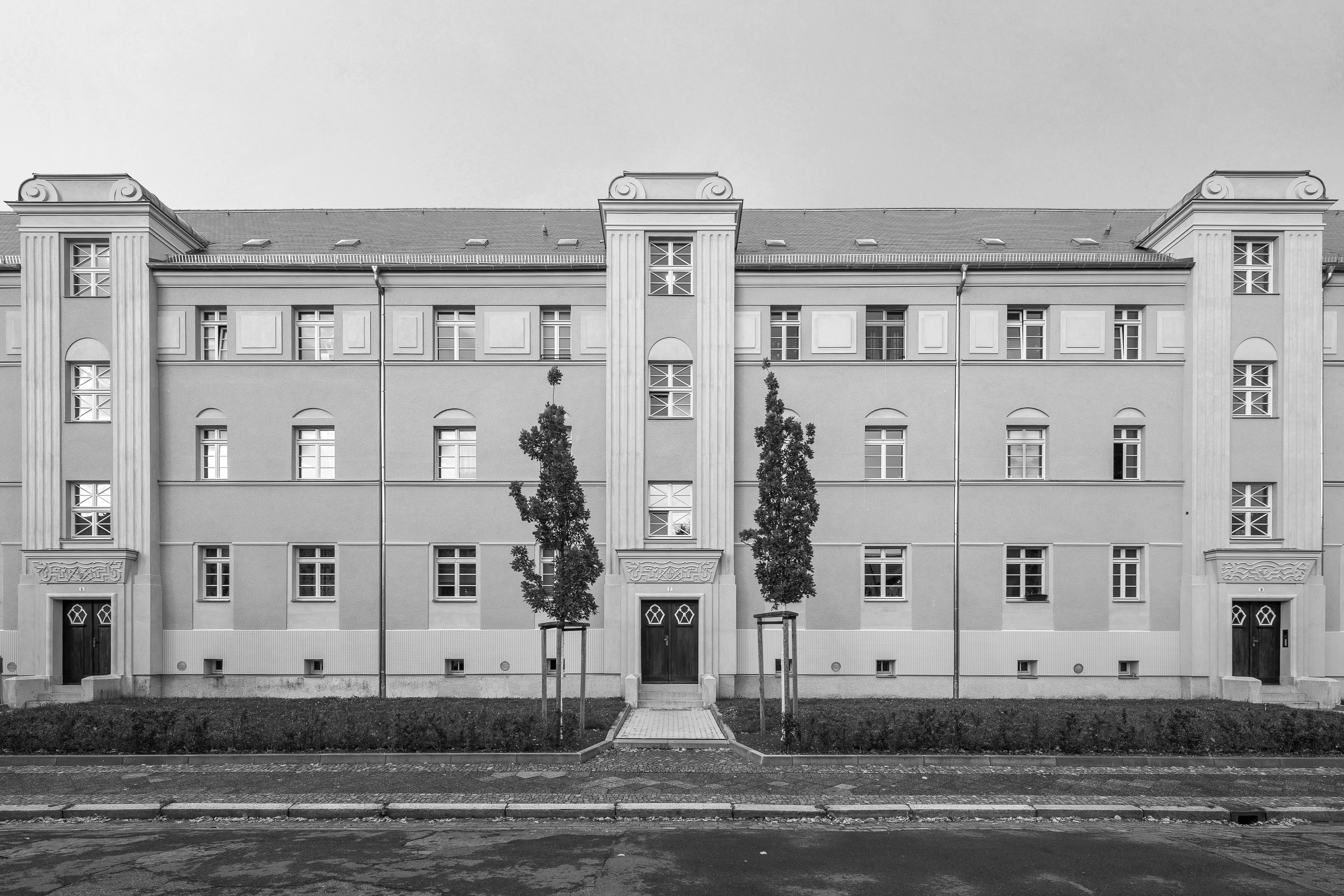 Das 1925 von Fritz Riemann entworfene Wohnensemble im Stadtteil Leipzig-Gohlis wurde nach langem Leerstand denkmalgerecht saniert. Die stark beschädigten Fassaden wurden in enger Abstimmung mit der Denkmalpflege sensibel überarbeitet. Originale Hauseingänge und Türen konnten erhalten und restauriert werden. Die Treppenhäuser wurden nach restauratorischen Befunden im Stil der 1920er Jahre neu gestaltet. Die 46 modernisierten Wohnungen wurden durch schlichte Stahlbalkone ergänzt.